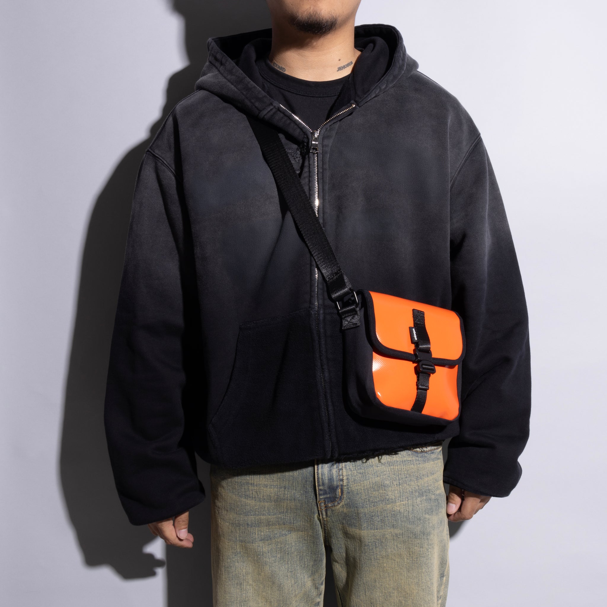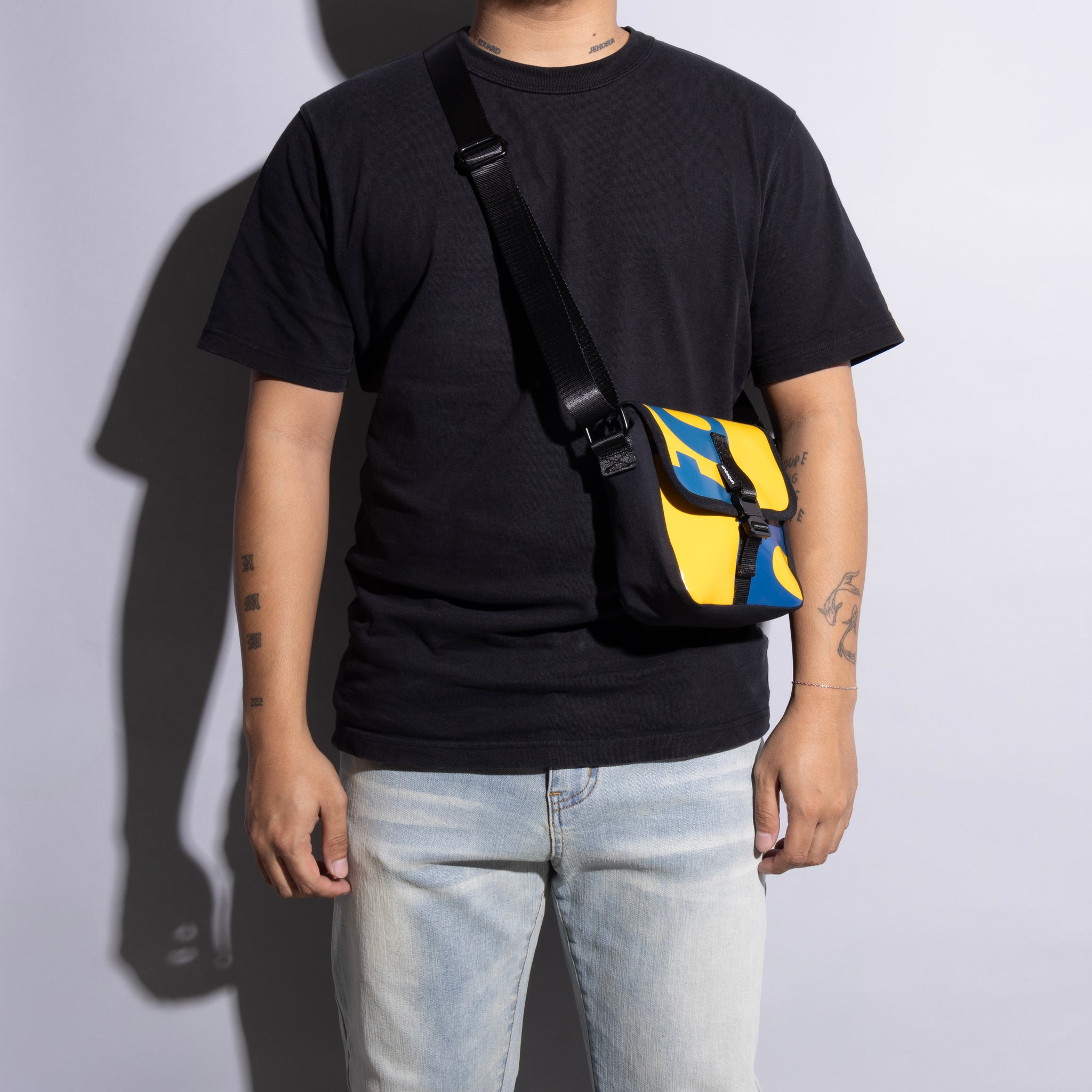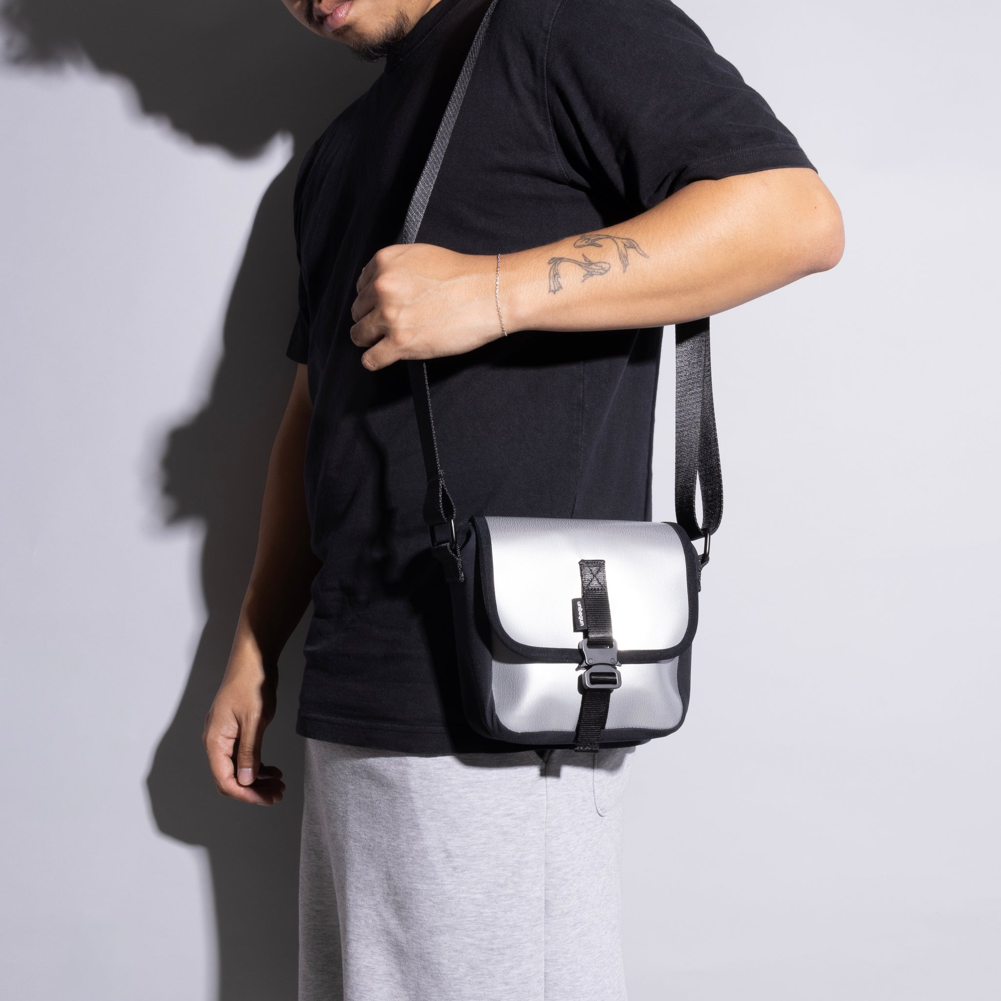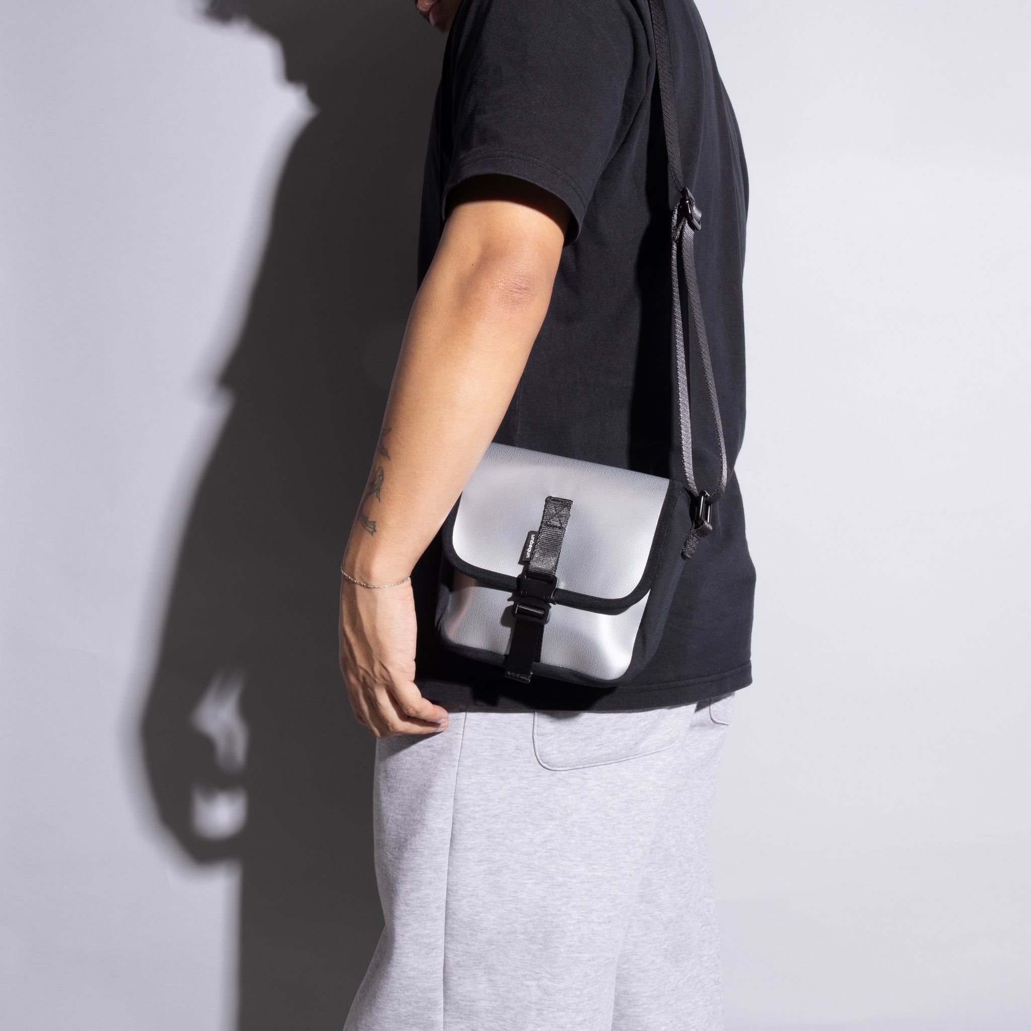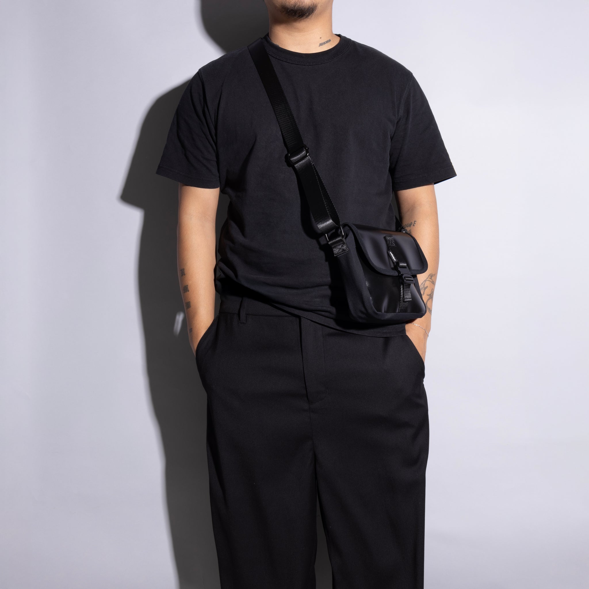 De tas sluit met een flap en een zwarte metalen klikgesp. Binnenin vind je een hoofdvak met een hoogwaardige rits en een klein insteekvakje voor je pasje of Apple AirTag. Er is genoeg ruimte voor je dagelijkse essentials, zoals je telefoon, paspoort, portemonnee en AirPods. De verstelbare schouderband is afgewerkt met zwarte metalen details en de zijkant is gemaakt van sterke Cordura-stof.
