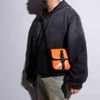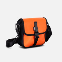 De oranje tas sluit met een flap en een zwarte metalen klikgesp. Binnenin vind je een hoofdvak met een hoogwaardige rits en een klein insteekvakje voor je pasje of Apple AirTag. Er is genoeg ruimte voor je dagelijkse essentials, zoals je telefoon, paspoort, portemonnee en AirPods. De verstelbare schouderband is afgewerkt met zwarte metalen details en de zijkant is gemaakt van sterke Cordura-stof.