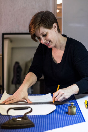 Tous les produits Unbegun sont entièrement faits à la main à Amsterdam. Après lavage, les matériaux sont soigneusement frottés, puis découpés sur mesure selon des patrons. Ensuite, nos couturières transforment ces pièces en produits uniques.